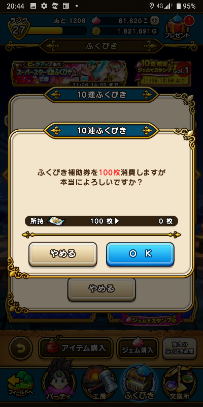 スーパースター装備ふくびき補助券100枚を使います。