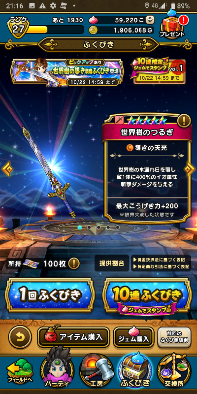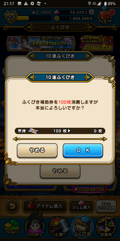 世界樹の導き装備ふくびき補助券を100枚使います。